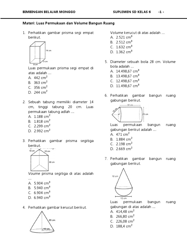 Sementara untuk bangun ruang sisi lengkung terdiri atas kerucut, tabung. Dan jika diperhatikan dengan seksama, alas prisma tersebut berbentuk segitiga dan selimutnya berbentuk persegi panjang. A.268 cm3 b.278 cm3 c.288 cm3 d.298 cm3. Soal bangun ruang kelas 6 sd/mi ini akan menyajikan bank soal volume ruang dan juga bank soal menghitung luas permukaan bangun ruang. Volume bangun tersebut dapat dihitung dengan menjumlahkan volume kubus dan volume prisma.